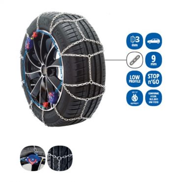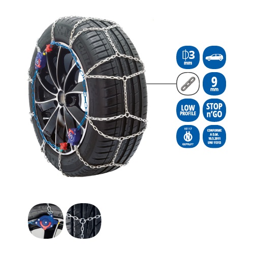 • Running surface in rhomboid shape made of special alloy steel, with ”D” profile links for safe grip on snow and ice.