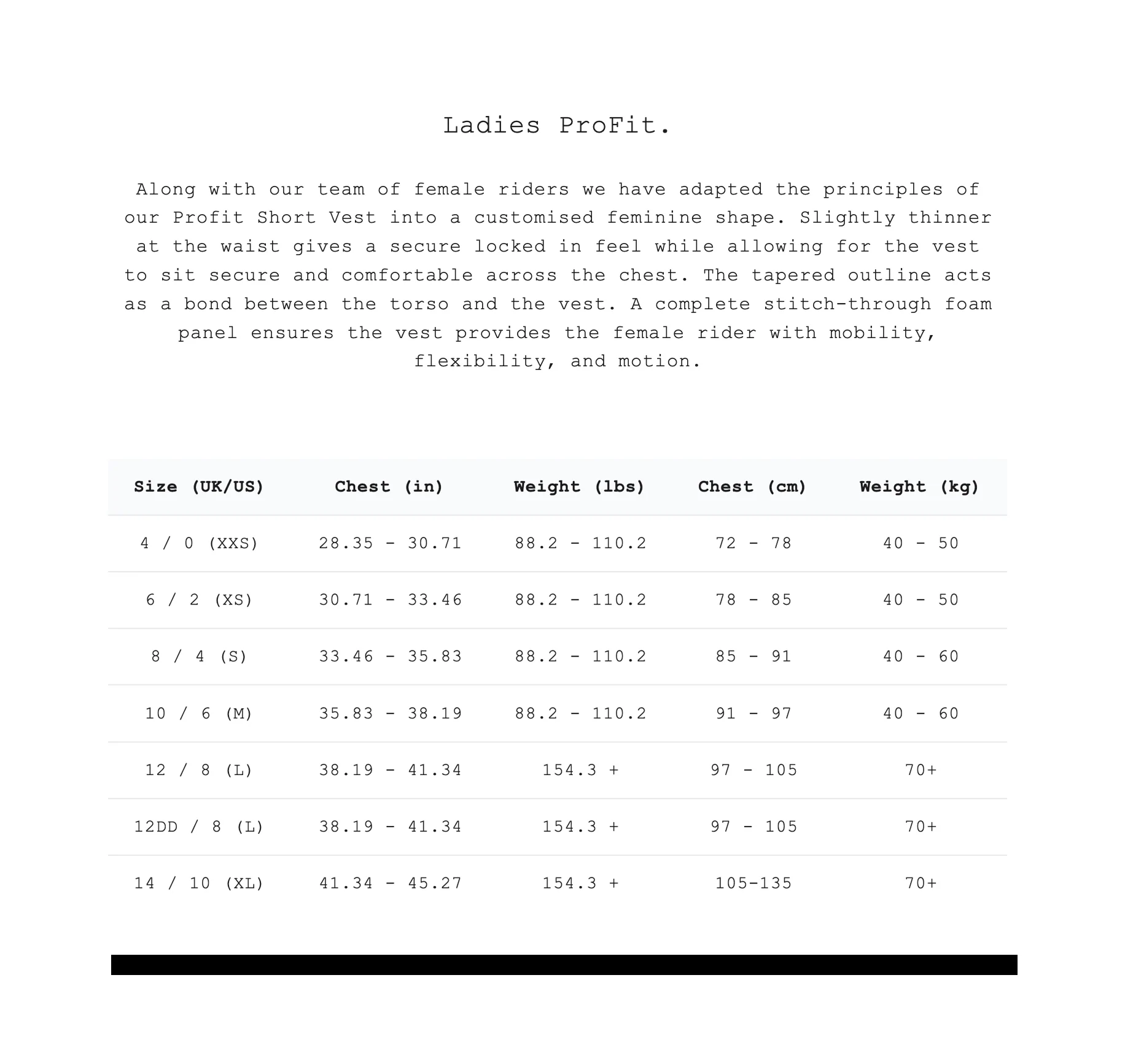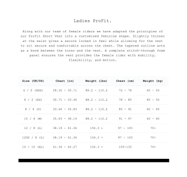 Ladies ProFit: Along with our team of female riders we have adapted the principles of our Profit Short Vest into a customised feminine shape. Slightly thinner at the waist gives a secure locked in feel while allowing for the vest to sit secure and comfortable across the chest.Thetapered outline acts as a bond between the torso and the vest. A complete stitch-through foam panel ensures the vest provides the female rider with mobility, flexibility, and motion.