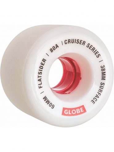 The Flatsider Cruiser Wheel in White/Red is a soft, flat-faced wheel with rounded lip and wide riding surface for a cruiser feel that breaks free easily into slides. Holds turns and slides consistently, while featuring stoneground for traction from the first push.