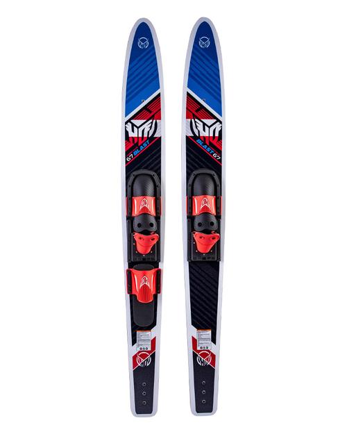 The HO Blast Combo Waterskis are a great way to have fun with the whole family at the lake. Their wide width construction make for easy starts and help skier progress. Combined with a V-Bottom design, the Blast Combos are stable and fun. You can also learn to drop a ski and progress to slalom skiing, as they’re equipped with a rear toe strap. Waterskiing is a great way to have fun with the whole family at the lake. They feature tip inserts compatible with the HO Trainer bar that keeps ski tips together, making starting and learning easy.