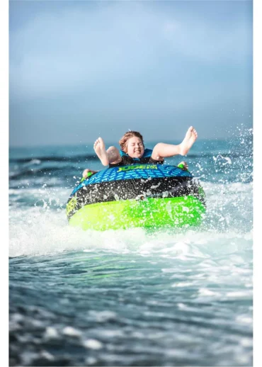 Introducing the Ridge 1P towable tube! The inner material is made of heavy-duty 24G PVC, making this tube strong and light for a lively feeling on the waves. The exterior is crafted from double-stitched 420D nylon to ensure durability and quality. With 4 neoprene knuckle guard handles, you get excellent grip and comfort. Connect and disconnect the rope in a flash with its quick rope connector. Jobe’s Ridge towable also features a drain for efficient water release after a stormy ride. Perfect for an exhilarating solo adventure!