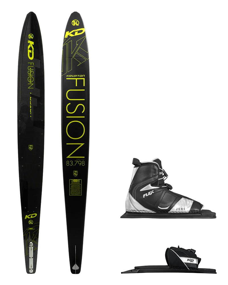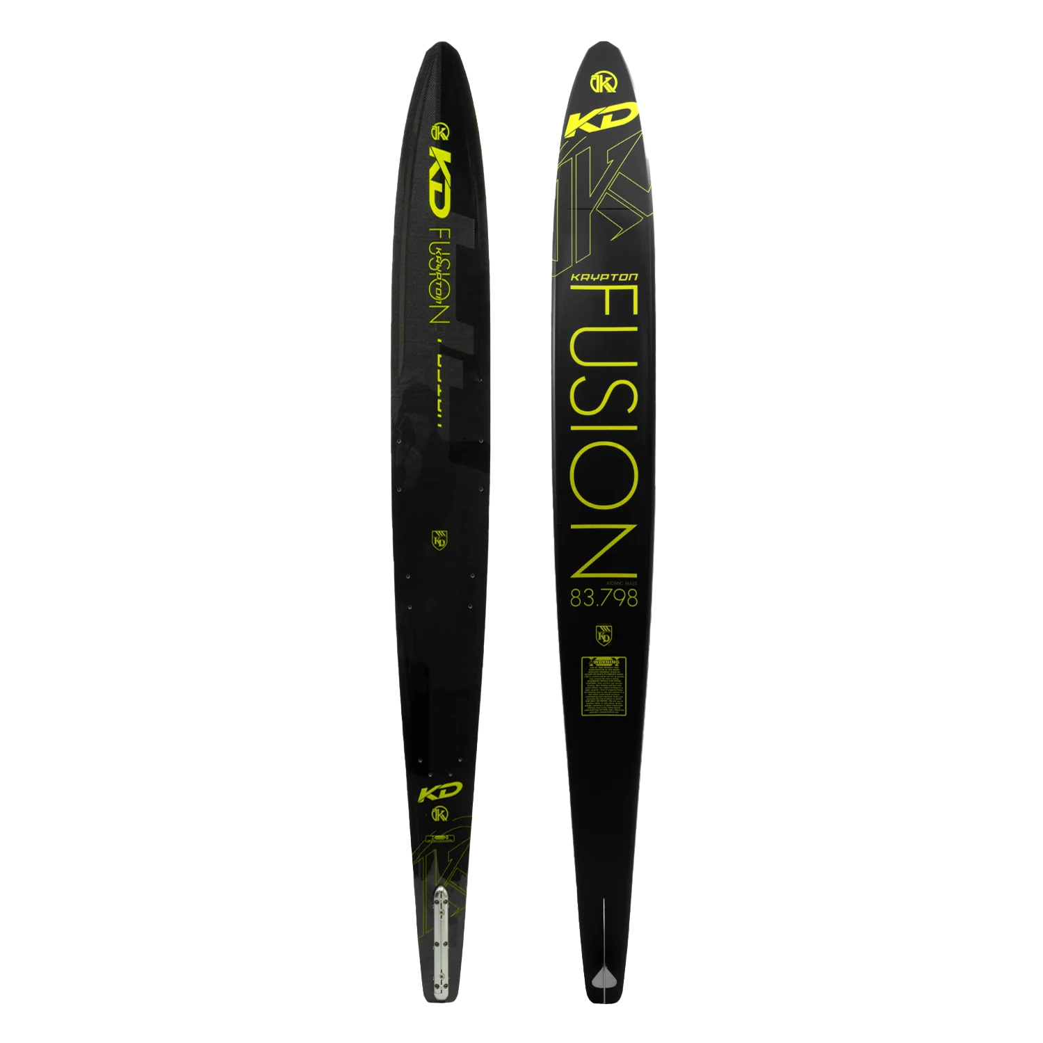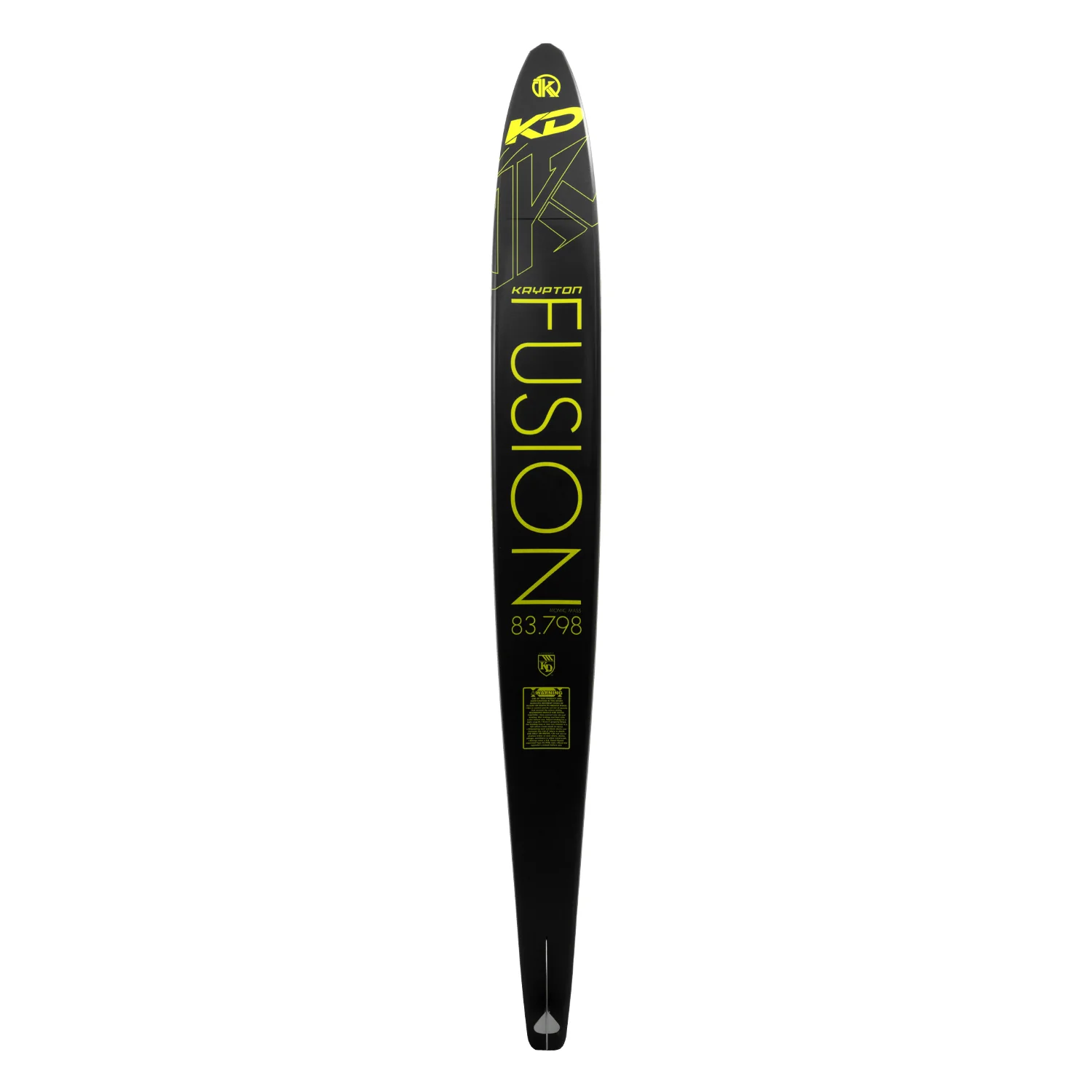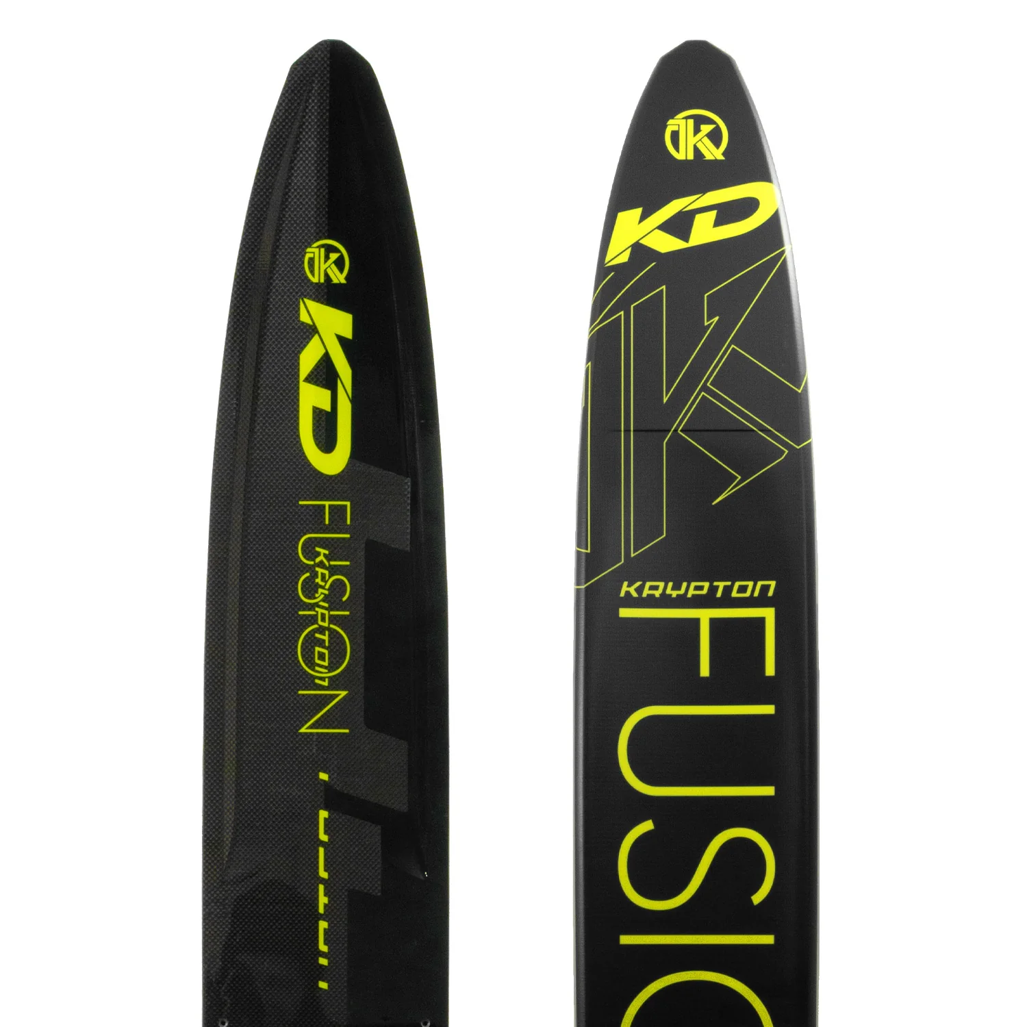 The KD Krypton Fusion is the cross-over weapon derived from the Titanium pro model, offering tournament specification in a slightly wider, open water-friendly width. With a slightly wider profile blending into an increased tail taper, the width allows the ski to sit stable underfoot while allowing you to stand over the ski and generate speed into and out of turns. An adjusted edge bevel allows the Krypton to handle and hold a greater angle when on edge to cut through the wash and hold a consistent speed. On the inside, the Krypton Fusion has a signature PVC core, wrapped in a carbon laminate, allowing the ski to be stiff and responsive while remaining lightweight. With signature tournament-style finishings, the Krypton is a swiss army knife that will carve up the open water and push the course alike.