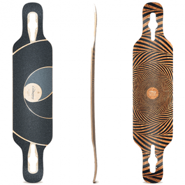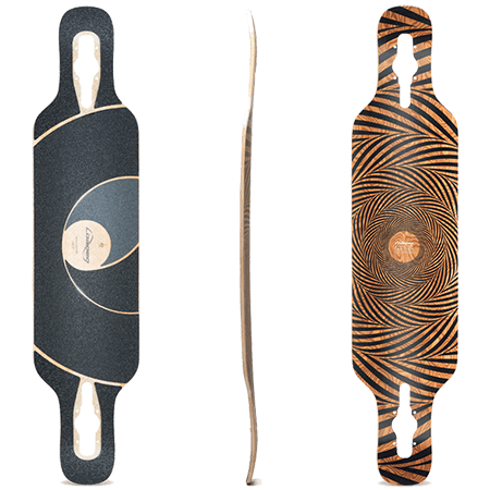 The Tan Tien longboard blends carve-oriented longboarding with advanced trick riding. A flexible deck, drop-through truck mounts, and usable kicks allow the Tan Tien to pack a lot into a relatively small package. The complex contours create a super responsive board that allows for increased confidence when leaning into turns, popping tricks, and powering through slides.