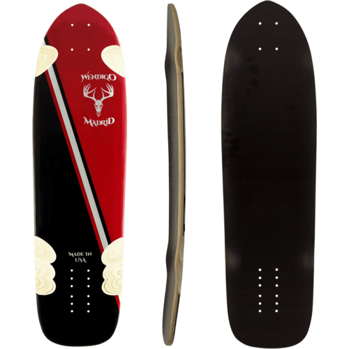 The Wendigo is Madrid’s do-everything board. The Formica/Maple constuction creates a zero-flex board with deep 3D concave to keep you stable and locked in. This top-mount will have you dreaming of speed every night after you take it for a ride. The board features an adjustable wheelbase pattern to allow you to customize your ride to suit your stance; coupled with massive wheel wells, you can rock some bigger diameter wheels without worrying about getting thrown off on those deep carves. This board is simple yet effective and has all the features you want in an all-around street-slaying speed-demon. The crew at Muir Skate recommend running 184mm Caliber Trucks and Blood Orange Liam Morgan Freeride Wheels.