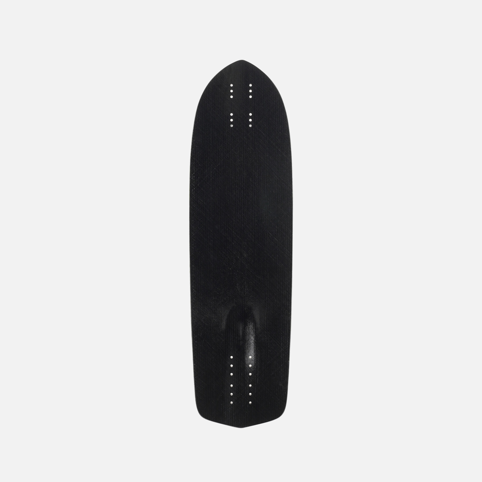 This board is equipped with flush mounting so that your trucks mount flat, but we minimize the depth of the cut so that we aren’t cutting away too much of the board and making it weak. Wheel wells are slightly asymmetrical to coincide with how most people will ride this board, with a high degree turning truck in front and a low degree stable truck in back.
