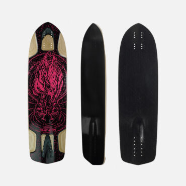 8 ply maple core. Black dyed triaxial fiberglass top and bottom. Like all Pantheon boards in the current lineup, the entire board is laminated with waterproof resin. While the deck is not entirely waterproof, it is much more weatherproof and warp resistant than many other boards. Downhill stiffness out of the box.