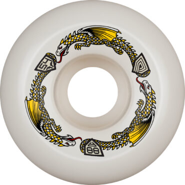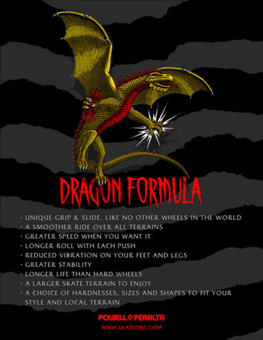 Dragon Formula™ is Powell Peralta’s latest next generation polyurethane breakthrough. Dragons are mid hardness 88A, 93A and 97A wheels that smooth out rough terrain. Now you can roll over previously unskateable terrain on your way to a skate spot, and then skate it as well or better than before with the same wheels. This is because dragons slide like 99A & 101A wheels and still grip when needed. This makes dragons very special and unique.