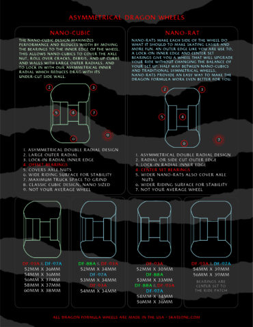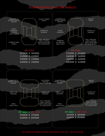 Dragon Formula has taken us a decade of development to perfect. they have amazing speed, a smooth ride, unequalled grip to slide ratio, vibration damping, and extra-long life. this formula is groundbreaking and will make skating more fun and expand the skate terrain available to dragon riders.