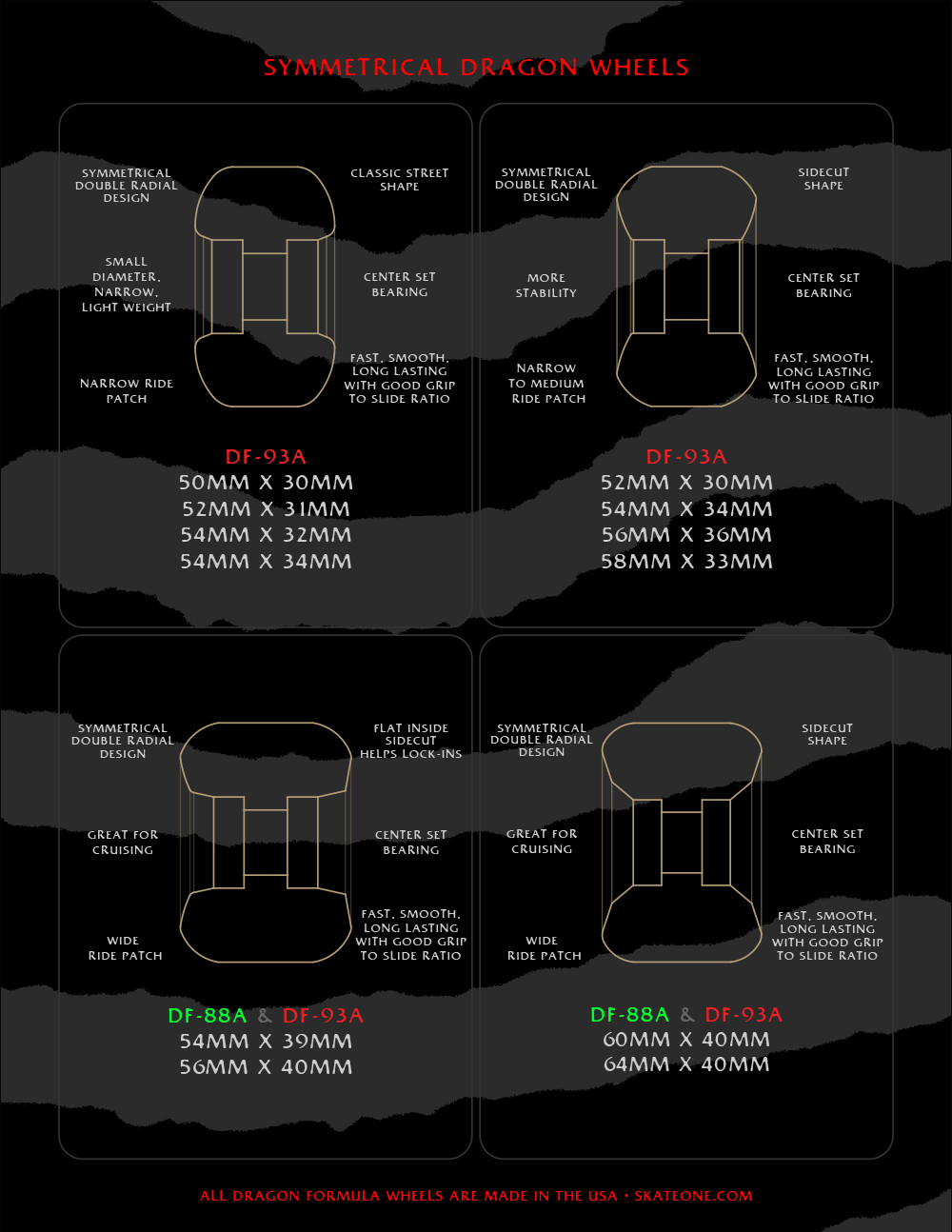 Our new Dragon 88’s are the softest, smoothest, and fastest members of the Dragon Formula family, offering an unequalled ability to grip and slide. DF-88’s help you glide over rough city streets on your way to a skate spot, gripping when you need it, and sliding with the ease of wheels 10 points harder!