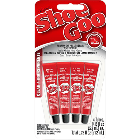Shoe Goo now in comes in single use bite sized pieces! In 1972 Shoe GOO was invented for “tennis toe” caused by dragging your shoe toe during “new” useable shoes again. The formula remains the same after all these years…not only do tennis players continue to use Shoe GOO, it has become very popular with skateboards and anyone not wanting to let go of those lucky shoes.