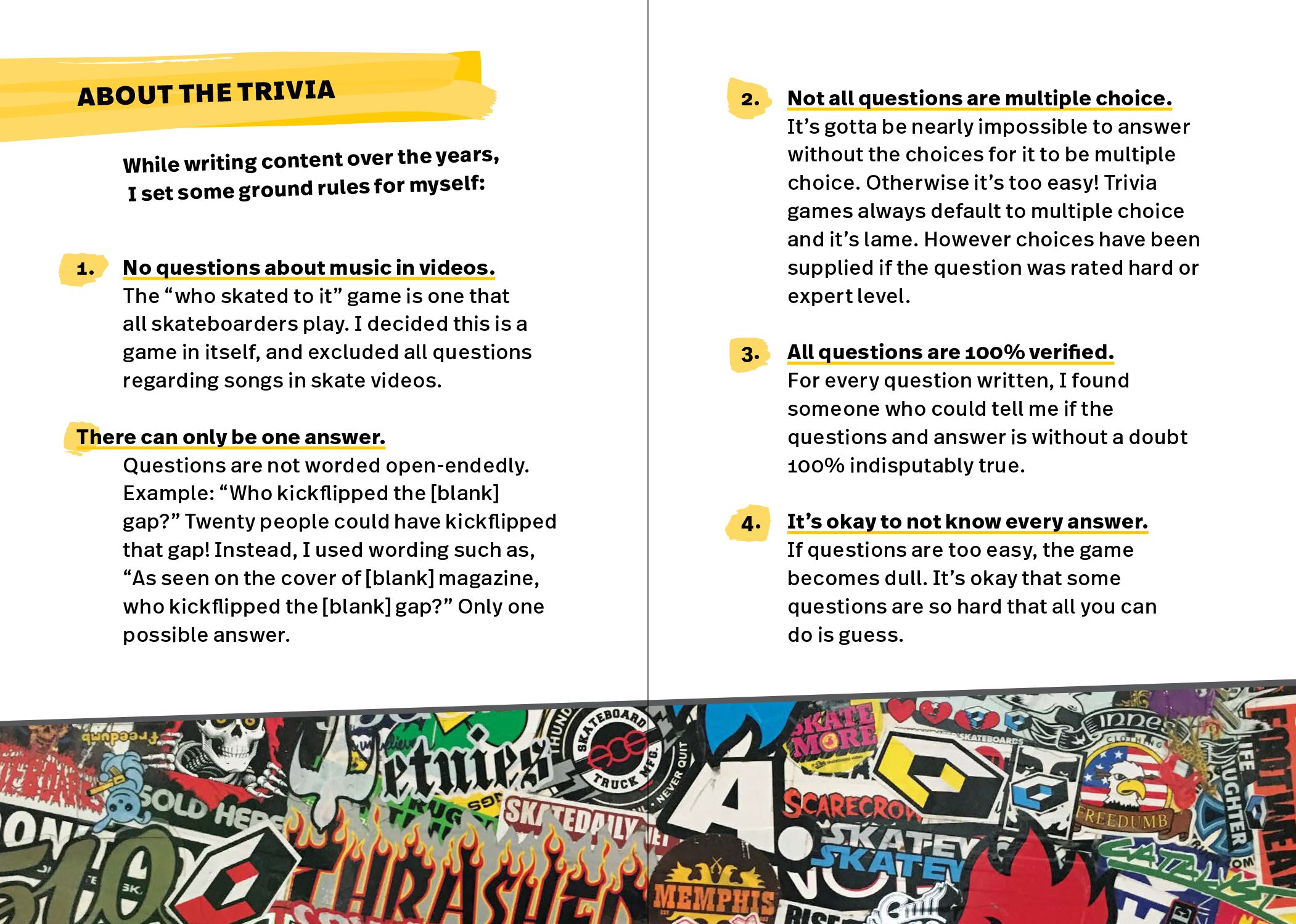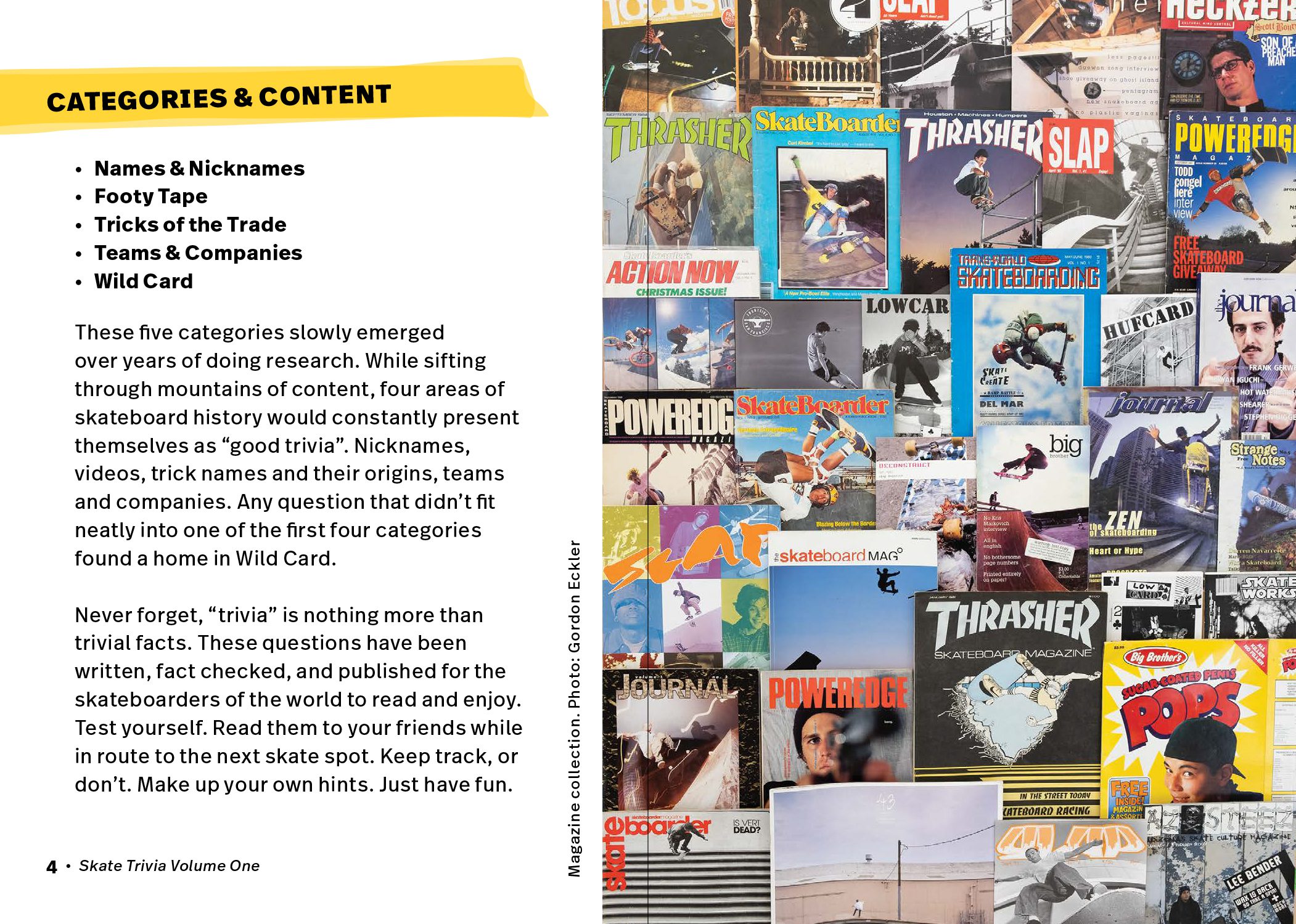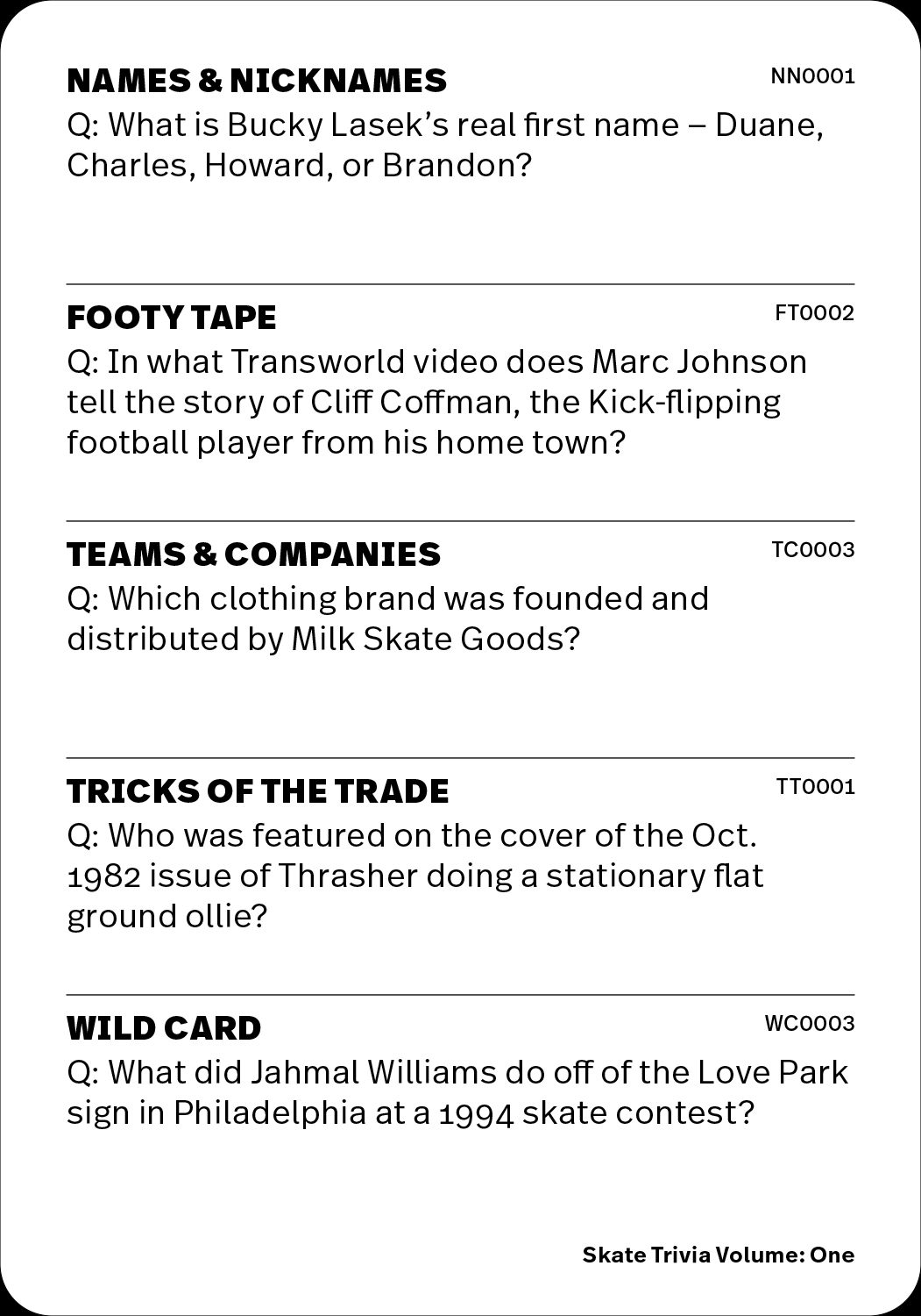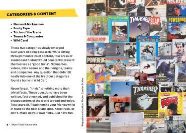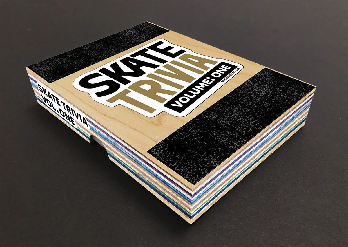 Gordon (Gordo) Eckler has been collecting and refining skate trivia questions for over 20 years. His questions have been checked, approved and vetted by a core group of skaters and industry veterans including Lance Mountain, Steve Caballero, Mark Whitely, Jim Thiebaud, Aaron Meza, Bryce Kanights, Ed Templeton and so many more. This set of 51 cards contains 250 questions ranging from fairly easy to devilishly hard. The trivia is drawn from 5 categories: Names & Nicknames, Footy Tape, Tricks of the Trade, Teams & Companies and Wild Card. Break ’em out for your next road trip, skate mission or game night! Hefty cards come in a chunky, nice-looking telescoping box with a booklet and sticker.