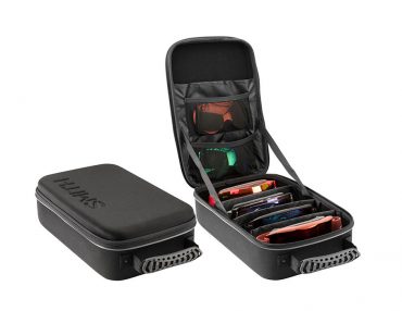 Stores up to four goggles. Dedicated storage slots for replacement lenses.