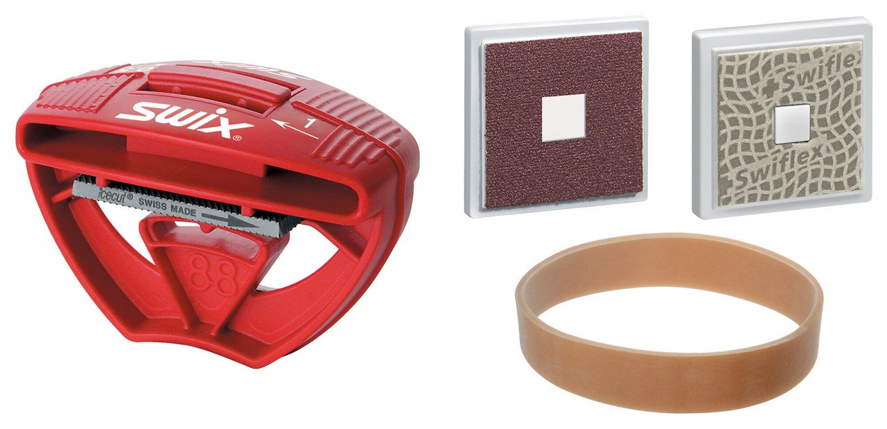 Tuning kit for steel edge maintenance. Contains pocket size file holder with file, diamond stone for polishing, abrasive stone for deburring steel edges and ski brake retainer.